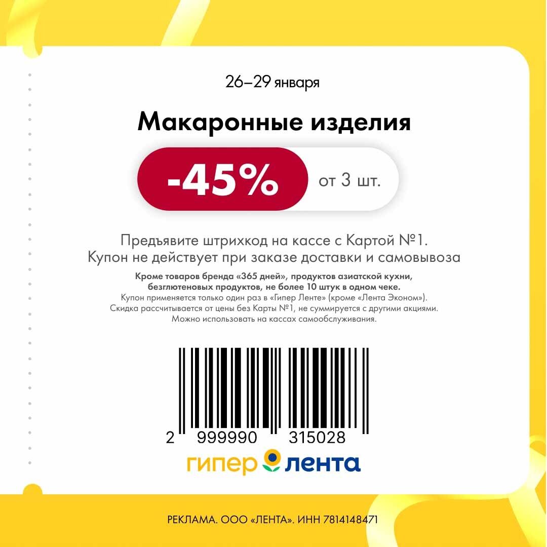 Купоны на скидки в гипермаркетах «Лента» на Январь 2026
