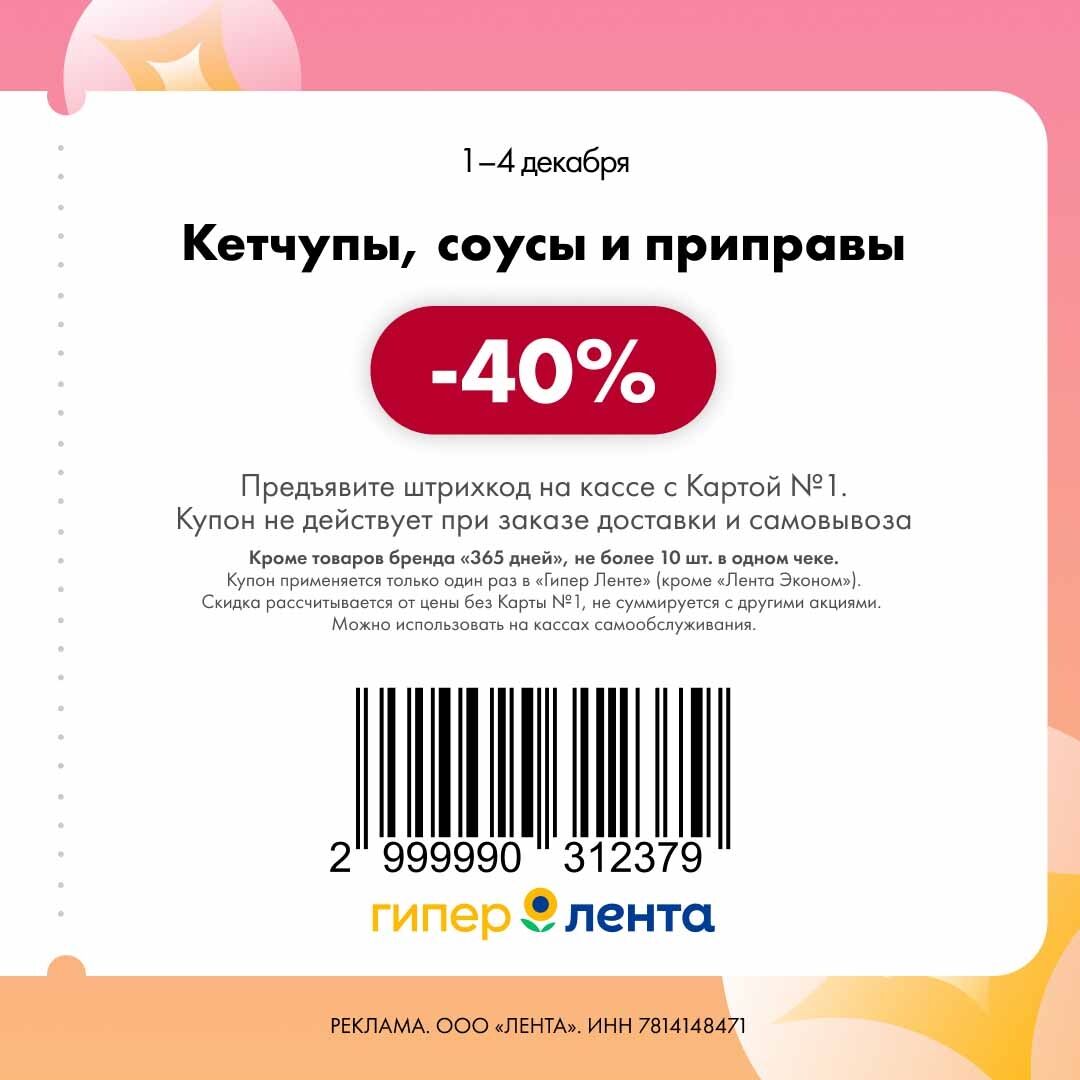 Купоны действуют с понедельника по четверг 1 - 4 декабря. Купон для питомцев действует только в «Ленте Зоомаркет».