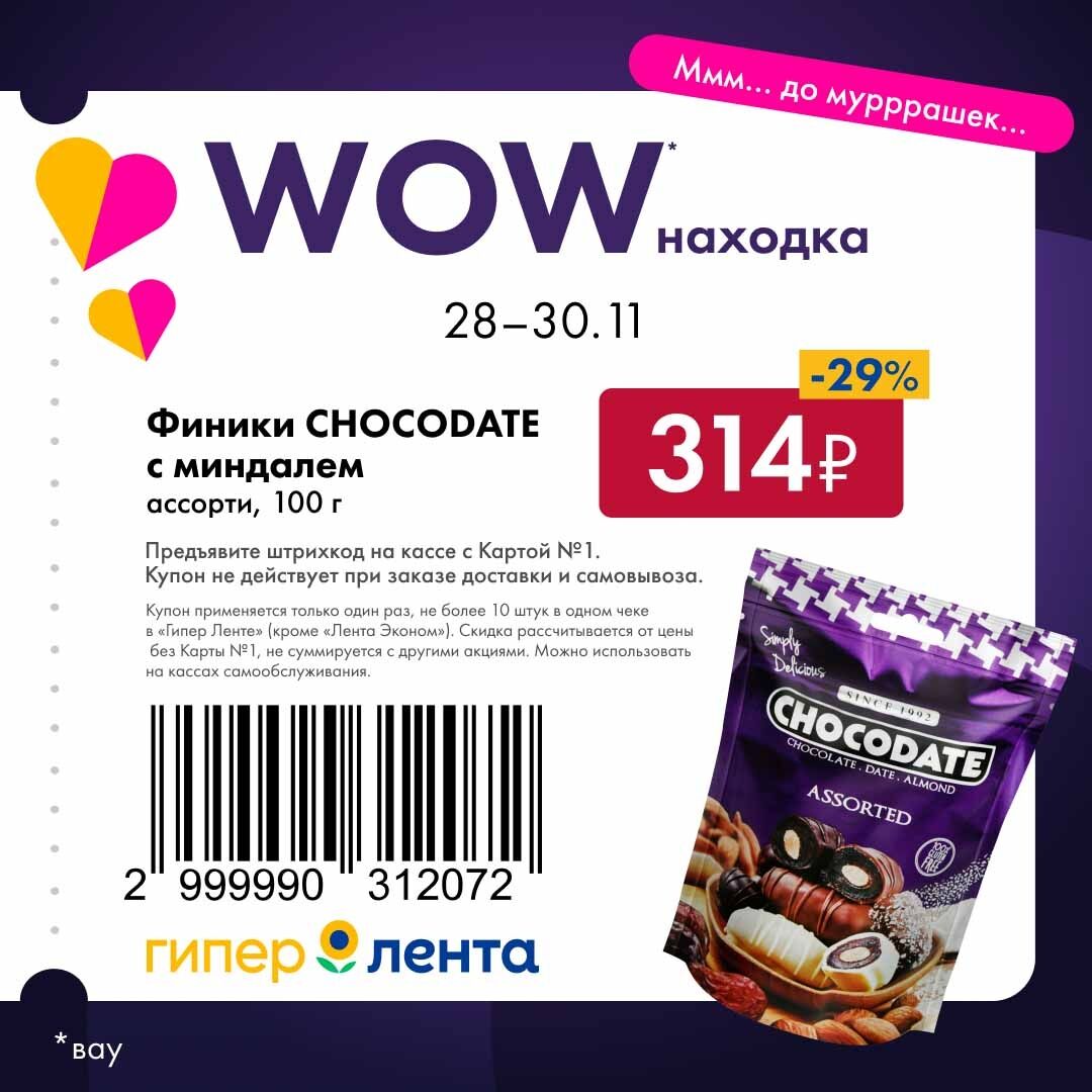 Купоны «WOW-находка» действуют с пятницы по воскресенье 28 - 30 ноября при предъявлении на кассе с Картой №1.*