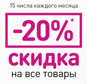 • 14 числа каждого месяца скидка 20% на косметику и бытовую химию.