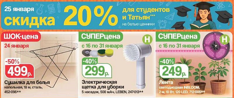 • 25 января скидка 20% для студентов и Татьян на белые ценники.